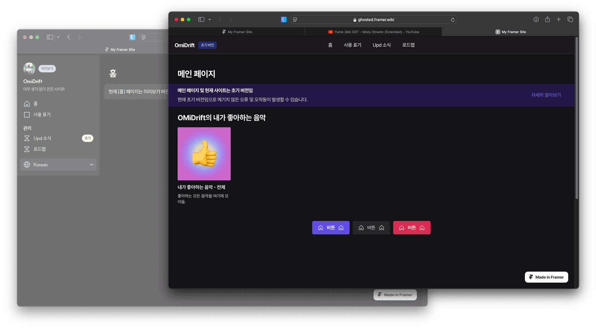 구 재생목록 페이지에서 Spotify의 재생목록을 선택하고 리다이렉트되는 방식의 페이지였으나, 리다이렉트라는 기능을 그대로 가지고 음악의 정보를 중점으로 디자인을 하였습니다. 그러므로, 위 이미지에 보이는(레이어 2) 것과 같이 완전히 새로운 재생목록 페이지를 갖추게 되었습니다.